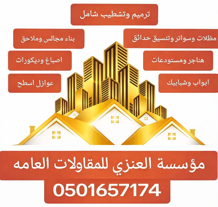 نحن مؤسسة العنزي للمقاولات العامة مؤسسة وطنية متخصصة في تنفيذ أعمال المقاولات المتكاملة، نعمل بخبرة ومهنية عالية في تركيب المظلات والسواتر، إنشاء الهناجر، ترميم وتشطيب المباني، بناء المجالس، وأعمال الأصباغ والديكورات والعوازل. نحرص على تقديم حلول عملية تجمع بين الجودة والمتانة والتصميم العصري، مع الالتزام التام بالمواصفات الفنية ومعايير السلامة. نؤمن بأن نجاحنا يبدأ من رضا عملائنا، لذلك نلتزم بالدقة في التنفيذ، والشفافية في التعامل، واحترام الوقت والميزانية. يعتمد فريقنا على كوادر فنية مؤهلة واستخدام مواد معتمدة تضمن نتائج تدوم طويلًا، لنكون الخيار الموثوق في جميع أعمال المقاولات العامة.